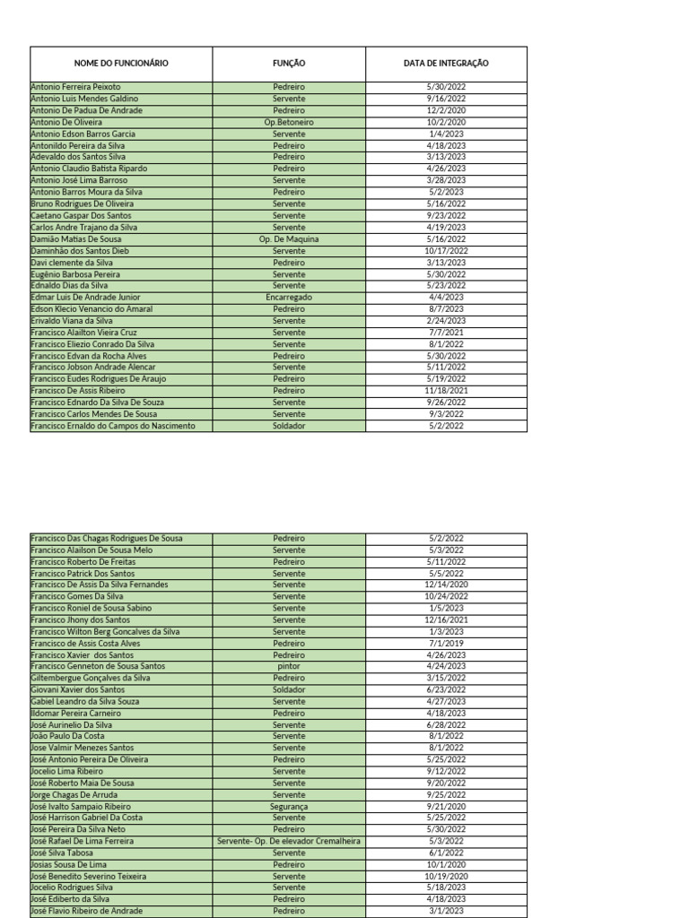 NOME DO FUNCIONÁRIO FUNÇÃO DATA DE INTEGRAÇÃO