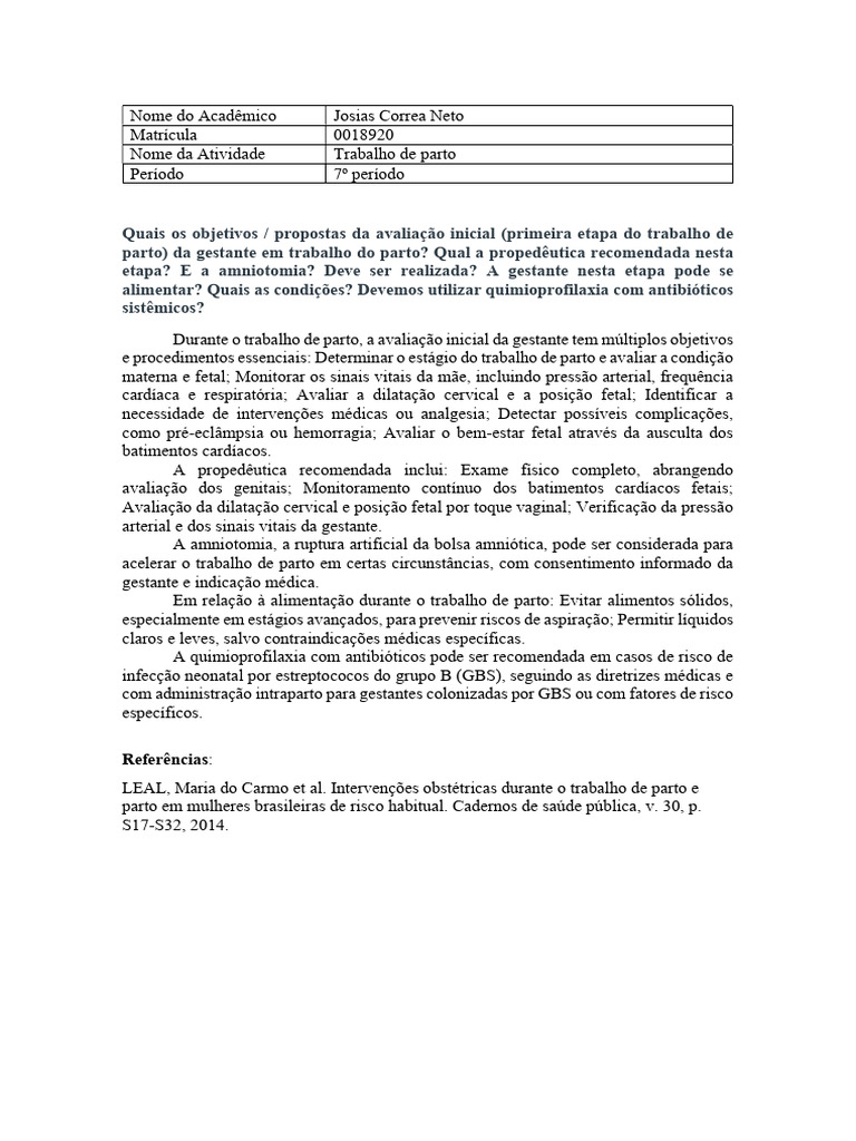 e procedimentos essenciais: Determinar o estágio do trabalho de parto e avaliar a condição