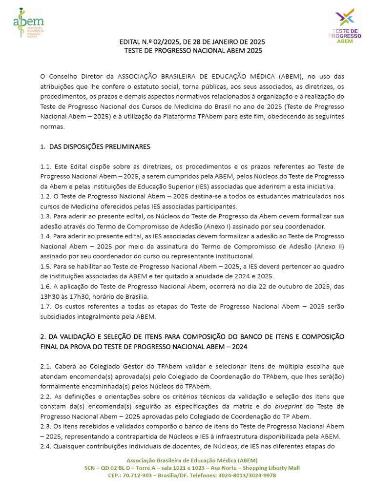 1.5. Para se habilitar ao Teste de Progresso Nacional Abem – 2025, a IES deverá pertencer ao quadro