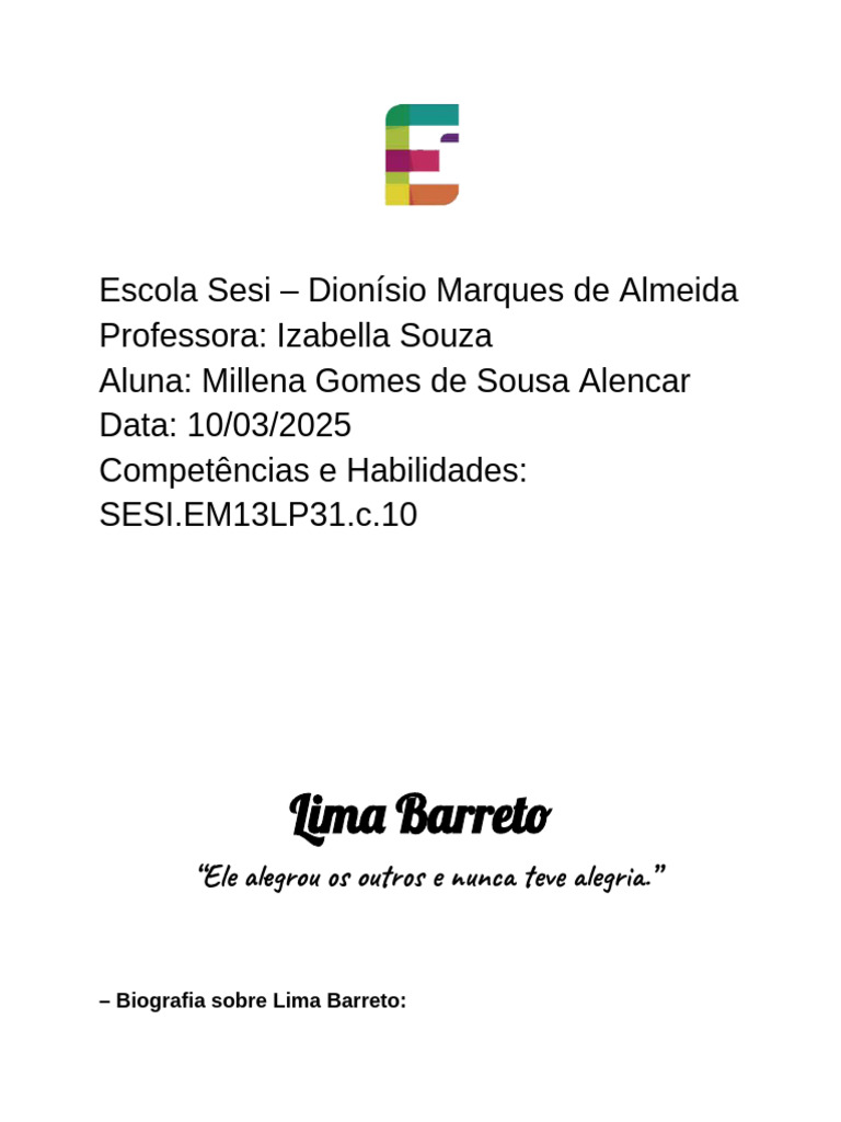 primária e morreu de tuberculose quando Lima Barreto tinha 6 anos. Seu pai era