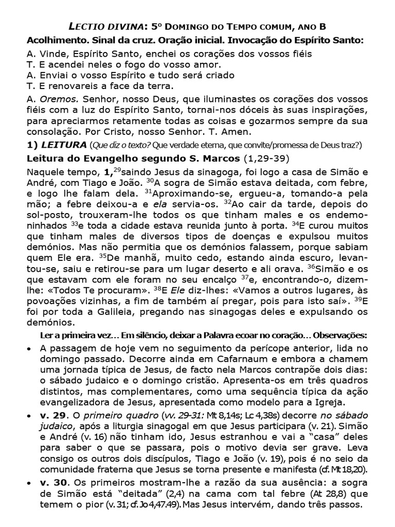 LECTIO DIVINA: 5O DOMINGO DO TEMPO COMUM, ANO B