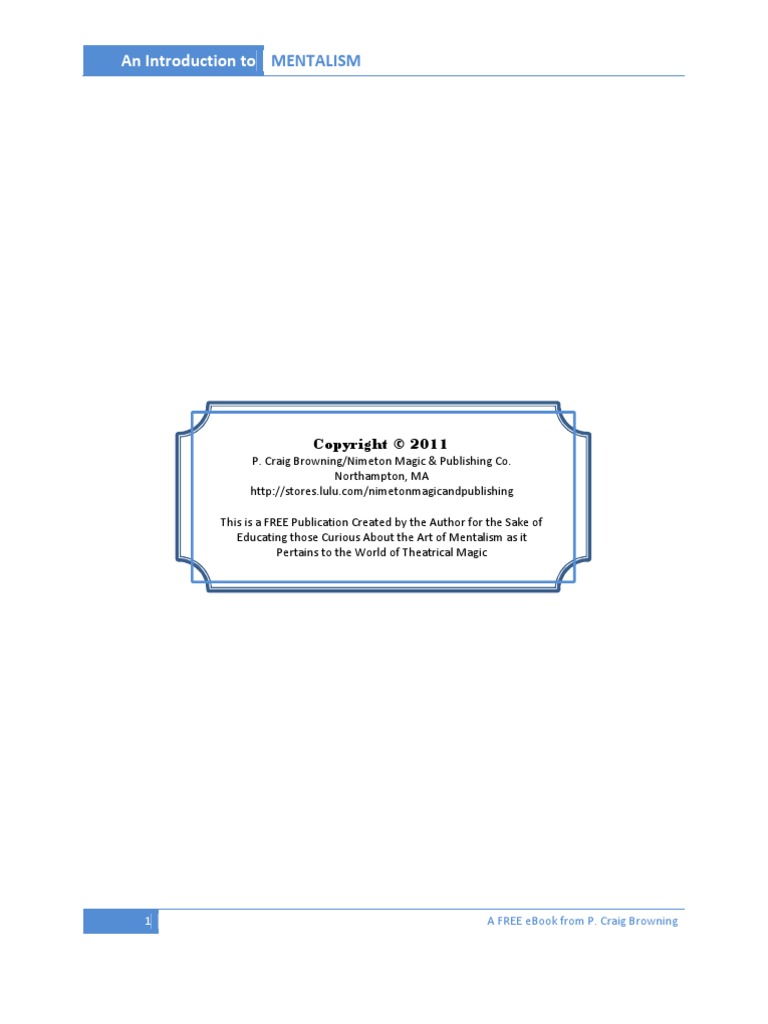 P. Craig Browning/Nimeton Magic & Publishing Co. Northampton, MA http://stores.lulu.com/nimetonmagicandpublishing This is a FREE Publication Created by the Author for the Sake of Educating those Curious About the Art of Mentalism as it Pertains to the World of Theatrical Magic