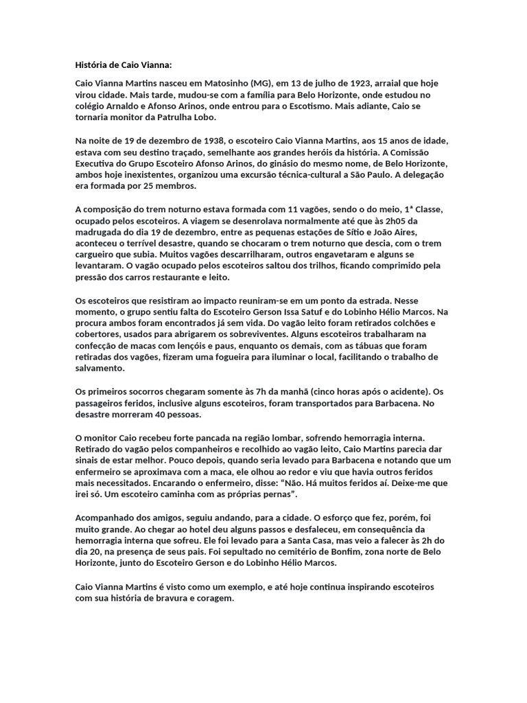 Na noite de 19 de dezembro de 1938, o escoteiro Caio Vianna Martins, aos 15 anos de idade,