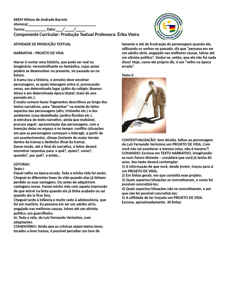 NARRATIVA - PROJETO DE VIDA um adulto sério, engajado nas melhores causas, talvez até