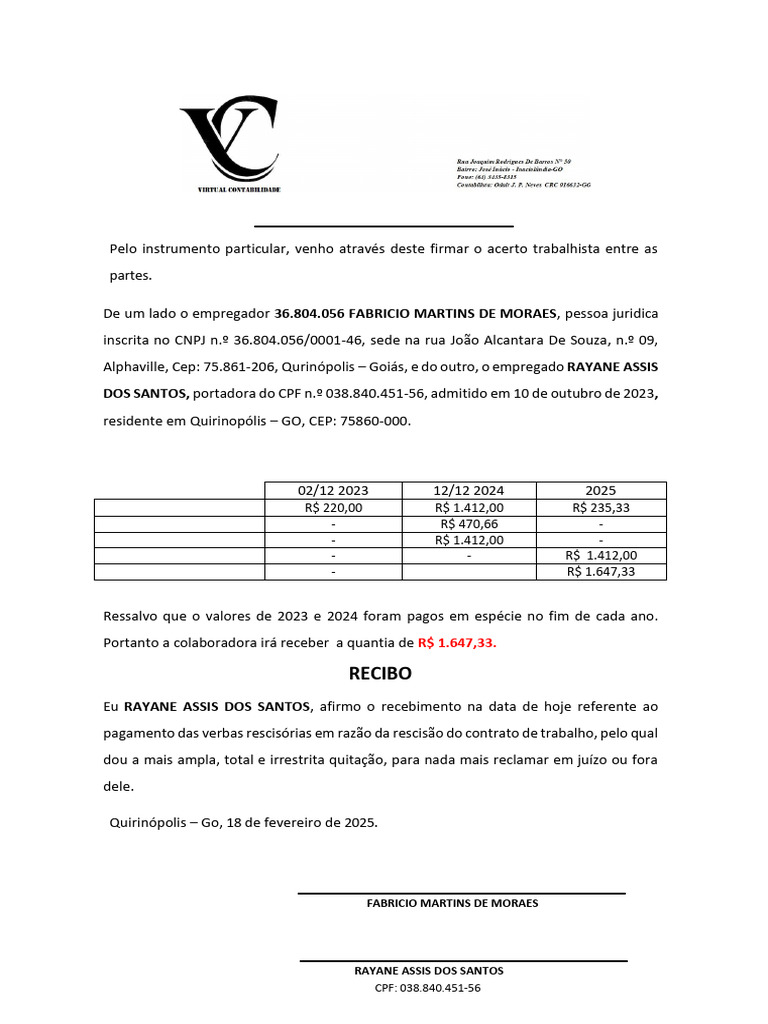Pelo instrumento particular, venho através deste firmar o acerto trabalhista entre as