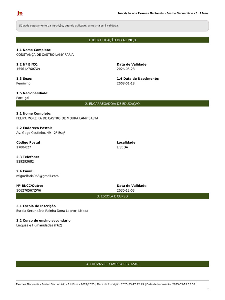 Exames Nacionais - Ensino Secundário - 1.ª Fase - 2024/2025 | Data de Inscrição: 2025-03-17 22:49 | Data de Impressão: 2025-03-19 15:59