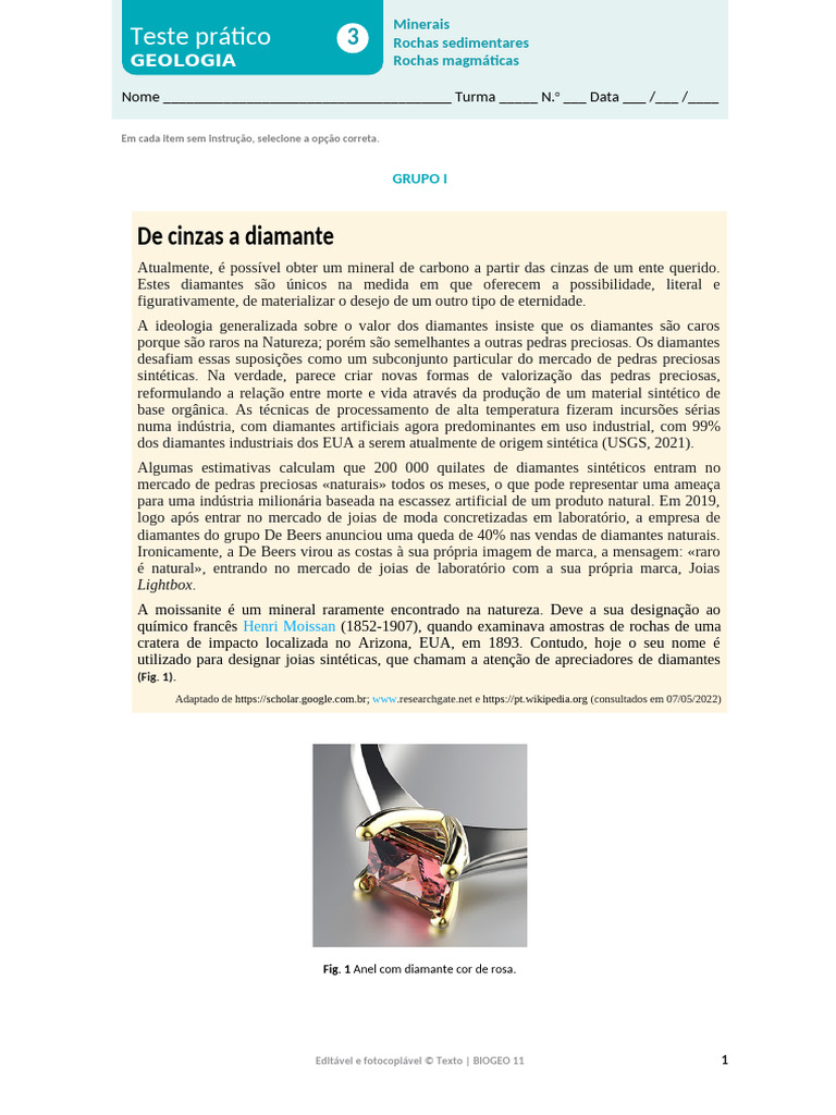 1. Um diamante obtido a partir das cinzas de um ser vivo, apesar de ser _______, não se