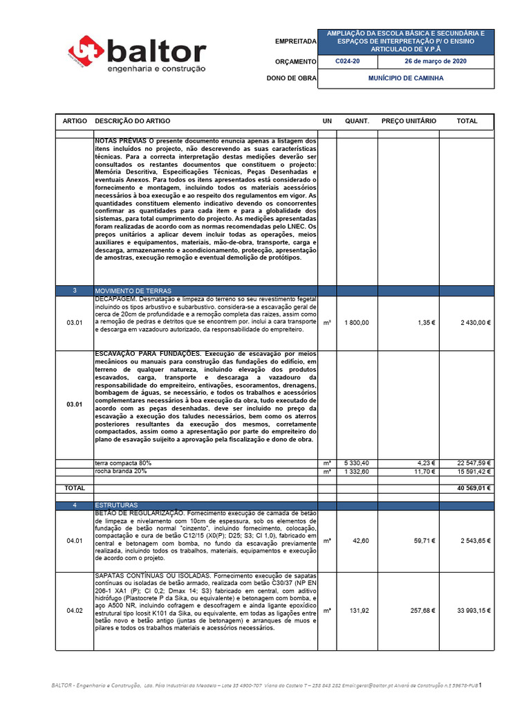 04.02 estrutural tipo Icosit K101 da Sika, ou equivalente, em todas as ligações entre m³ 131,92 257,68 € 33 993,15 €