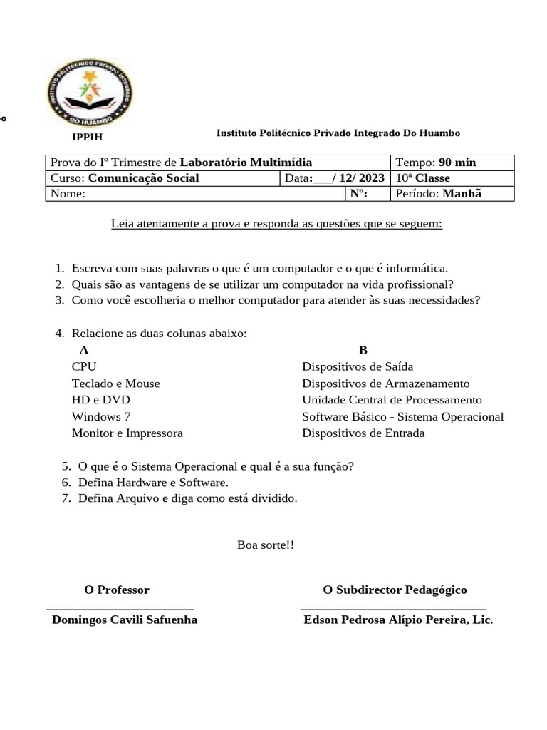 Curso: Comunicação Social Data:___/ 12/ 2023 10ª Classe
