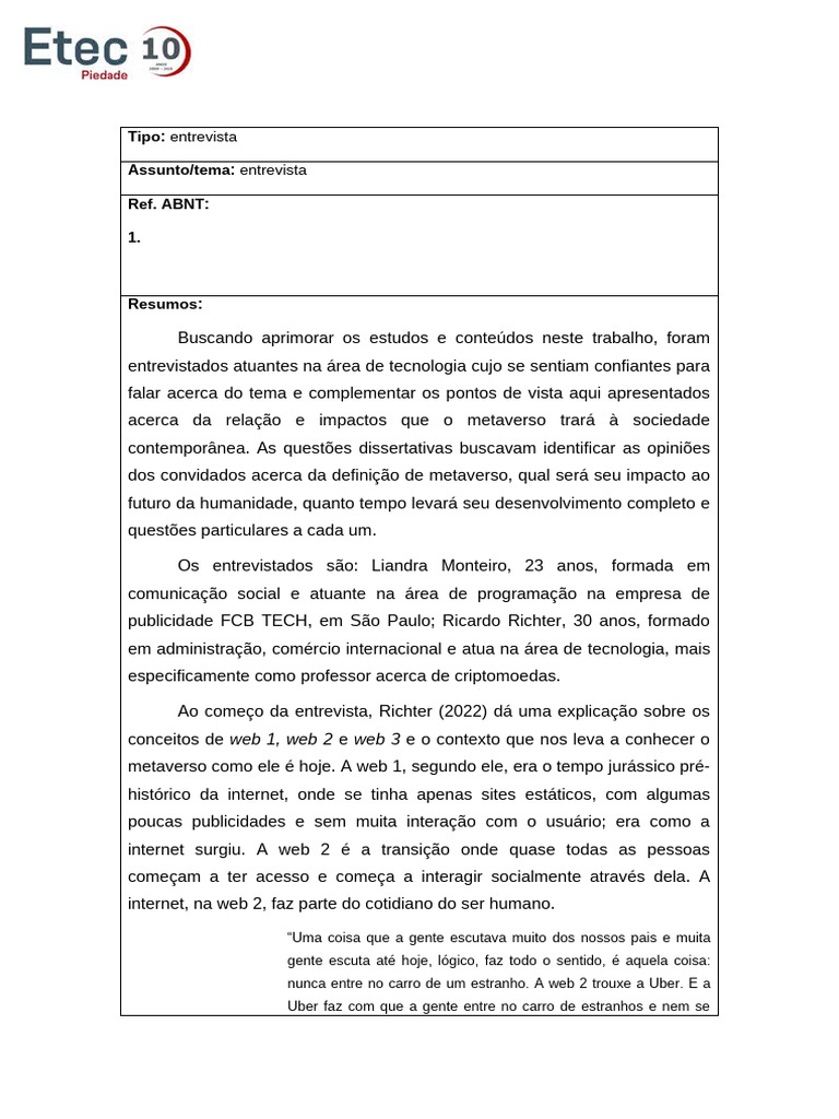 Assunto/tema: entrevista