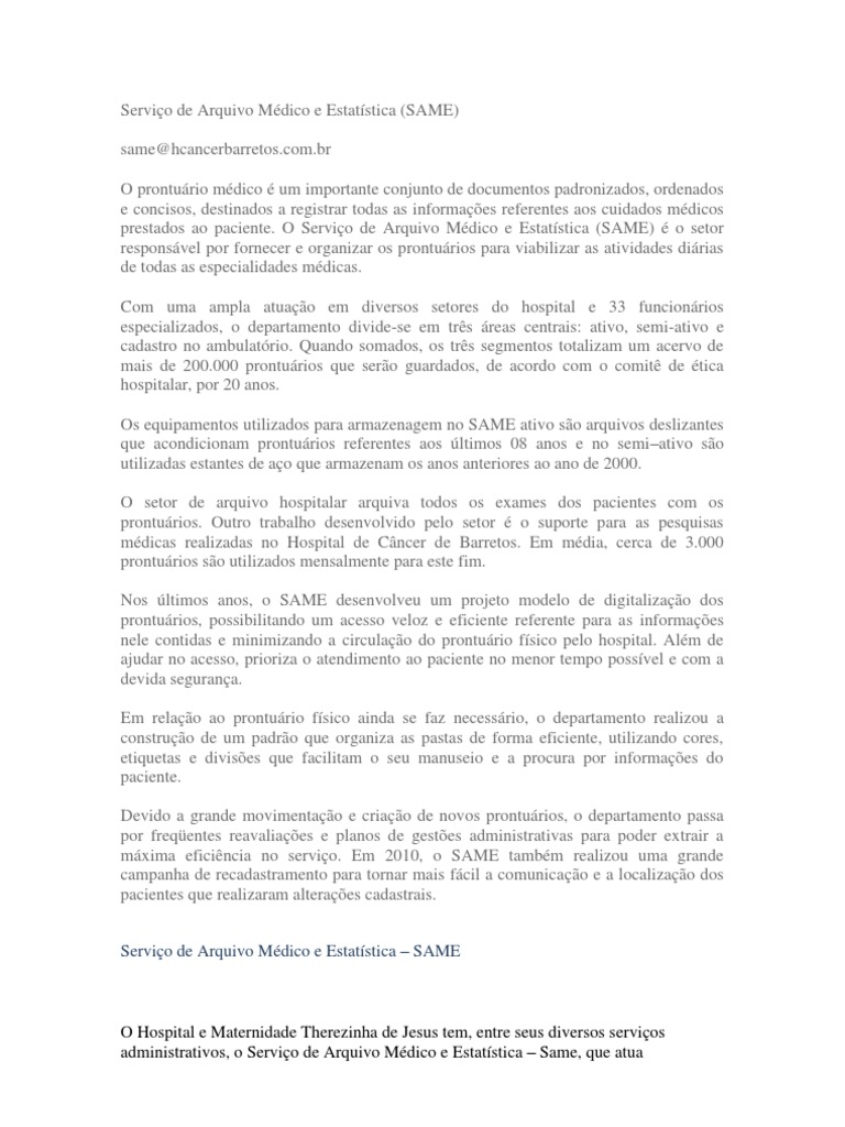 Same/HMTJ: O que ? O que faz? O Servio de Arquivo Mdico e Estatstica (Same) tem por finalidade a guarda e a preservao do pronturio mdico (dados pessoais, evoluo clnica, exames, radiografias etc.) e a elaborao de relatrios e boletins estatsticos referentes ao movimento hospitalar.