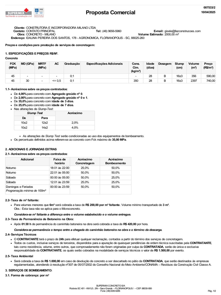 Obra: CONCRETO - MILANO Volume Estimado: 2000,00 m³
