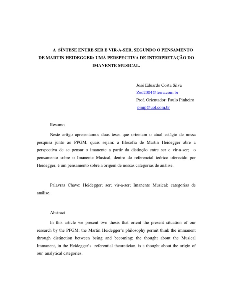 Resumo Neste artigo apresentamos duas teses que orientam o atual estgio de nossa pesquisa junto ao PPGM, quais sejam: a filosofia de Martin Heidegger abre a perspectiva de se pensar o imanente a partir da distino entre ser e vir-a-ser; Heidegger, um pensamento sobre a origem de nossas categorias de anlise. o pensamento sobre o Imanente Musical, dentro do referencial terico oferecido por