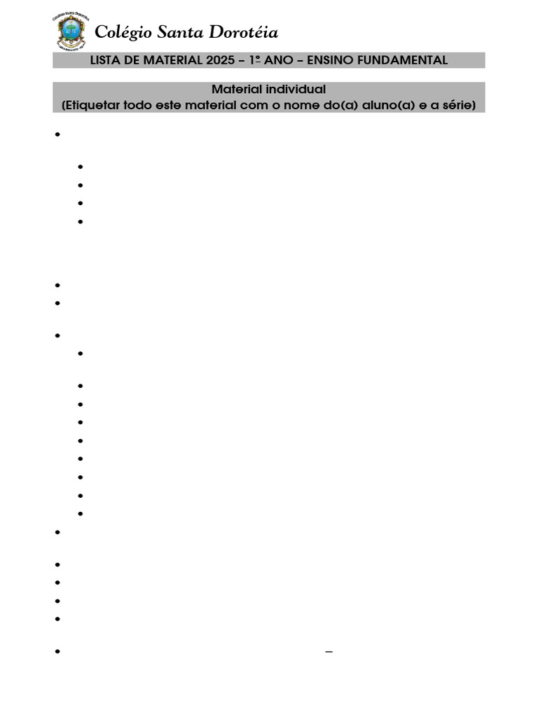 LISTA DE MATERIAL 2025 – 1º ANO – ENSINO FUNDAMENTAL