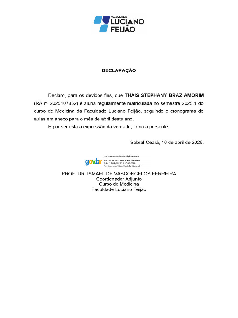Declaro, para os devidos fins, que THAIS STEPHANY BRAZ AMORIM