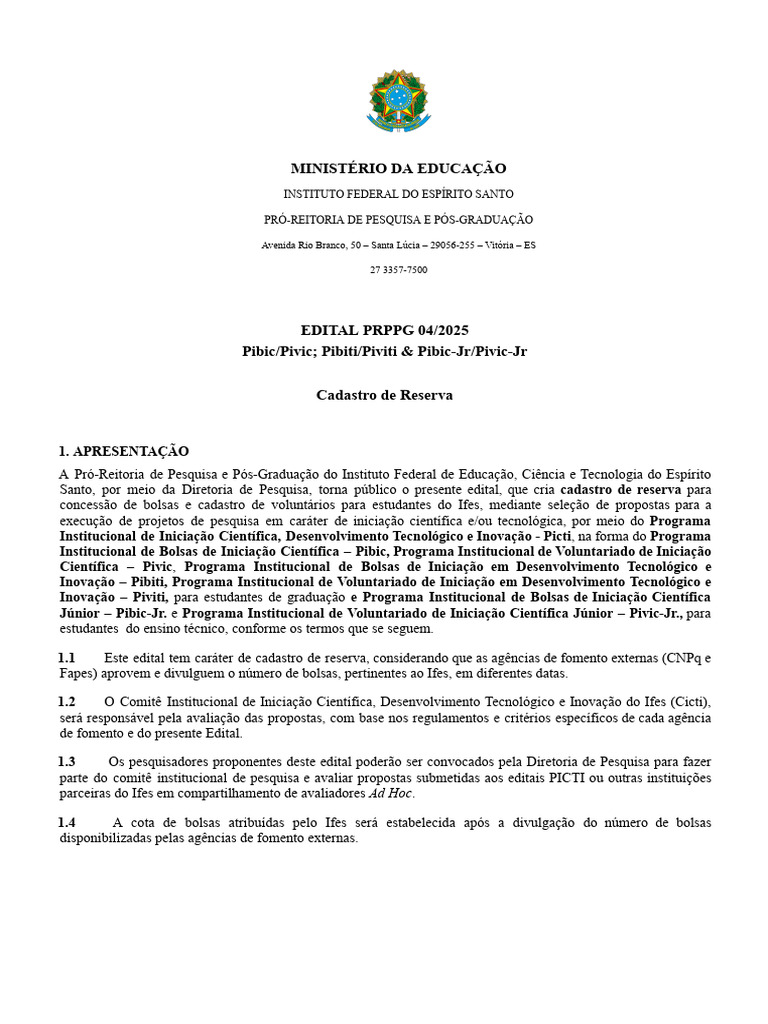 concessão de bolsas e cadastro de voluntários para estudantes do Ifes, mediante seleção de propostas para a