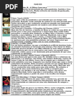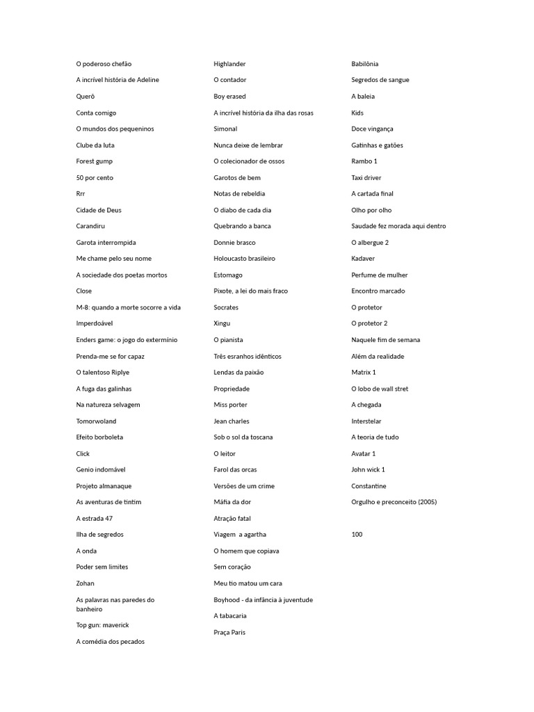 O documento lista uma série de filmes, abrangendo diversos gêneros e temas. Inclui títulos clássicos e contemporâneos, como 'O poderoso chefão', 'Matrix 1' e 'A comédia dos pecados'. A variedade sugere um catálogo diversificado de opções cinematográficas.