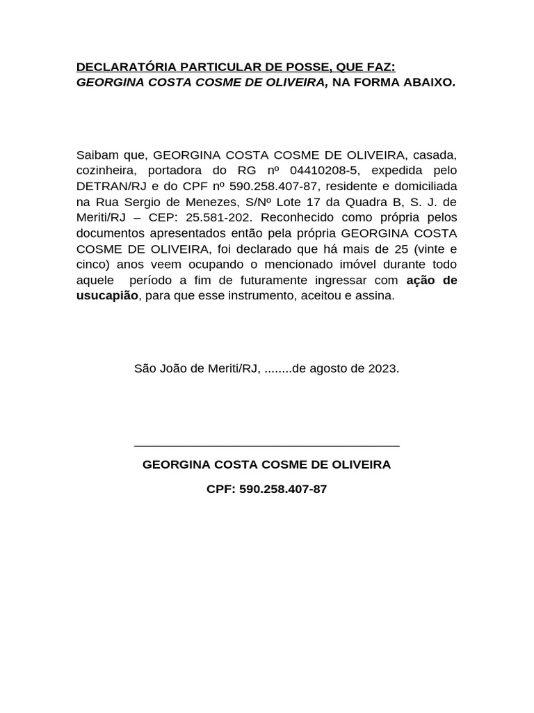 Meriti/RJ – CEP: 25.581-202. Reconhecido como própria pelos