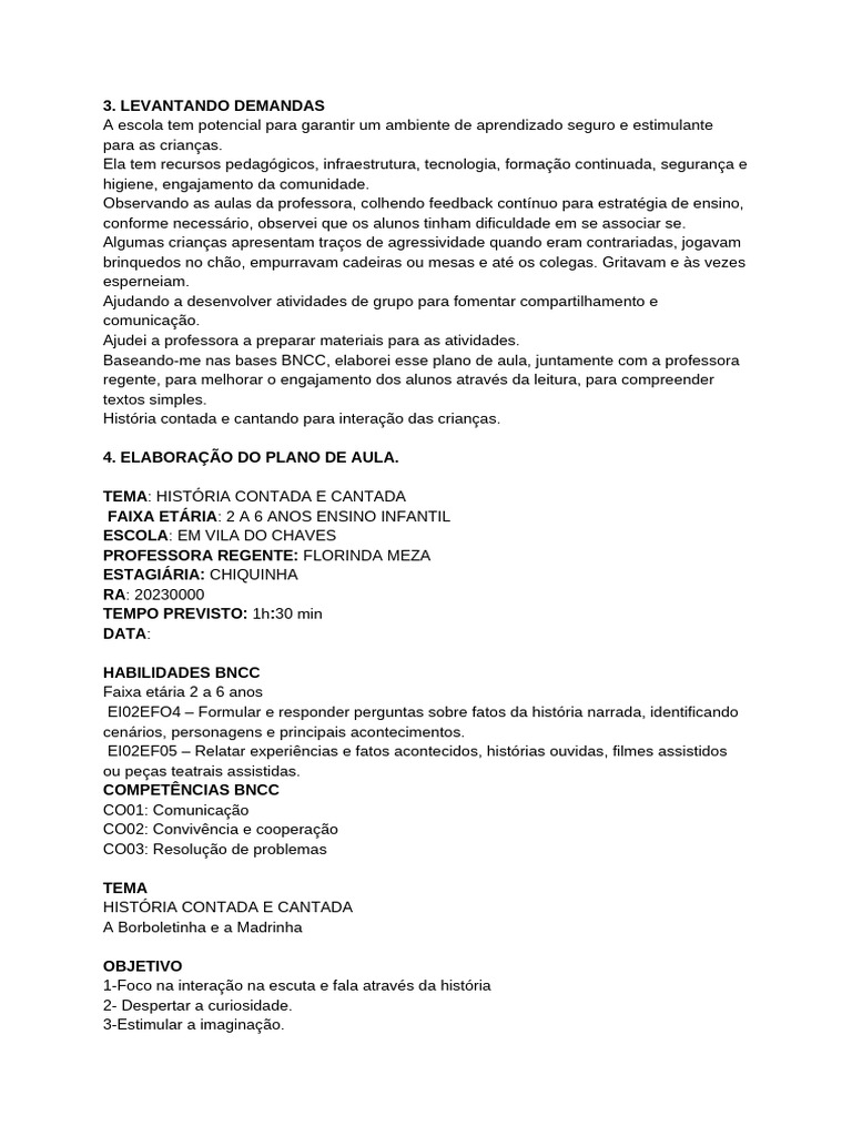 Baseando-me nas bases BNCC, elaborei esse plano de aula, juntamente com a professora