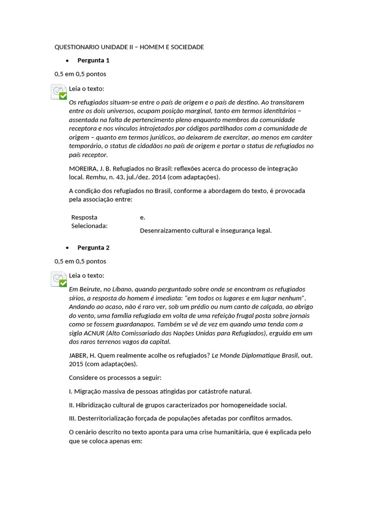QUESTIONARIO UNIDADE II – HOMEM E SOCIEDADE