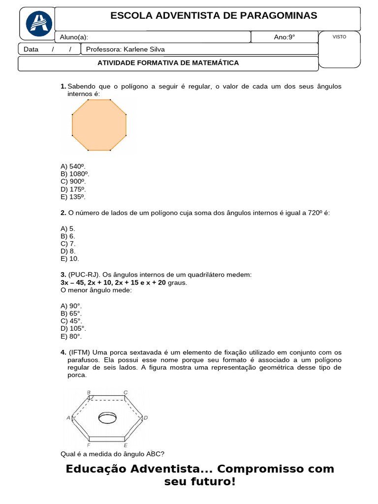 2. O número de lados de um polígono cuja soma dos ângulos internos é igual a 720º é: