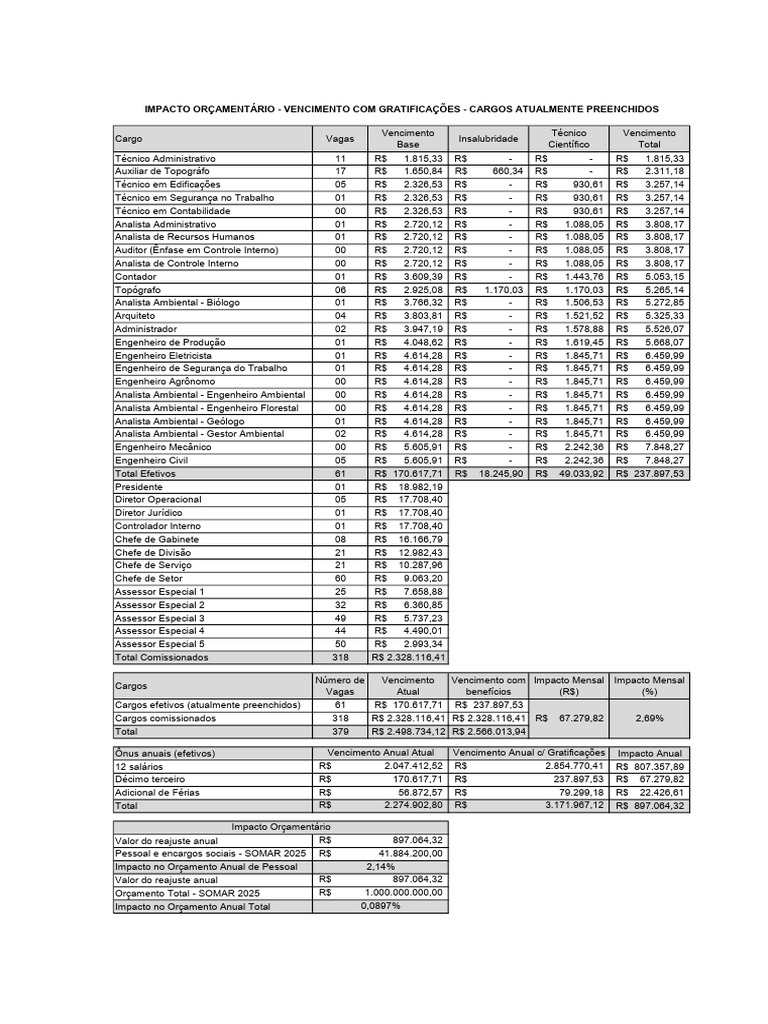 IMPACTO ORÇAMENTÁRIO - VENCIMENTO COM GRATIFICAÇÕES - CARGOS ATUALMENTE PREENCHIDOS