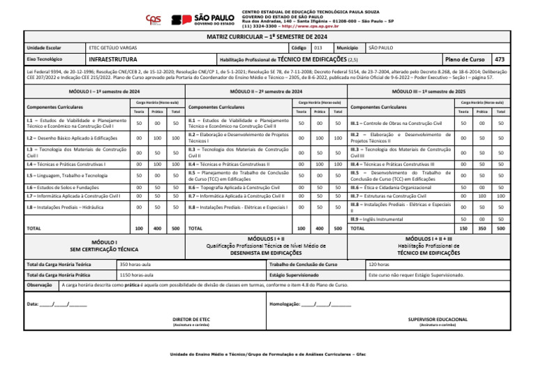 Eixo Tecnológico INFRAESTRUTURA Habilitação Profissional de TÉCNICO EM EDIFICAÇÕES (2,5) Plano de Curso 473