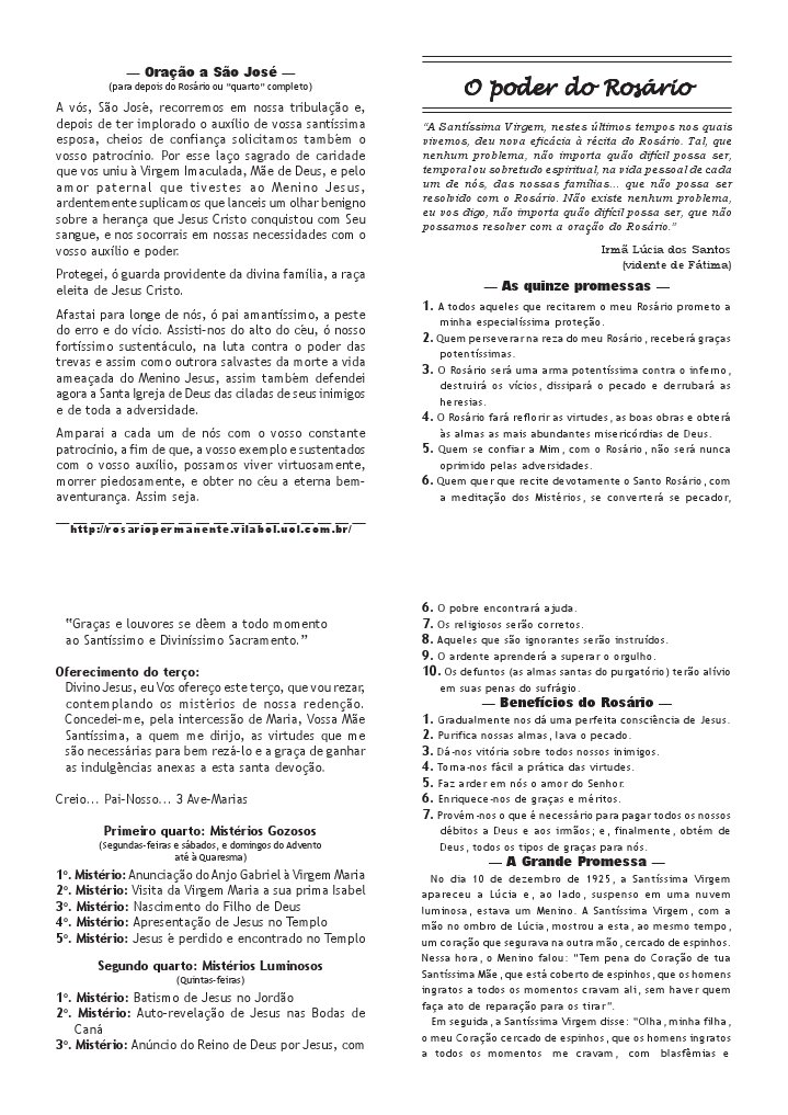 crescer em graa se justo e ser feito digno da vida eterna. 7. Os devotos do Meu Rosrio na hora da morte, no morrero sem sacramentos. 8. Aqueles que rezam o Meu Rosrio encontraro, durante sua vida e na hora de sua morte, a luz de Deus e a plenitude das suas graas e participaro dos mritos dos abenoados no Paraso. 9. Eu libertarei todos os dias, do Purgatrio, as almas devotas do Meu Rosrio. 10. Os verdadeiros filhos do Meu Rosrio gozaro de uma grande alegria no Cu. 11. Aquilo que se pedir com o Rosrio se obter. 12. Aqueles que propagarem o Meu Rosrio sero por mim socorridos em todas as suas necessidades. 13. Eu consegui do Meu Filho que todos os devotos do Rosrio tenham por irmos, em sua vida e na hora de sua morte, os Santos do Cu. 14. Aqueles que recitarem o Meu Rosrio fielmente sero todos meus filhos muito amados, irmos e irms de Jesus. 15. A devoo do Santo Rosrio um grande sinal de predestinao.