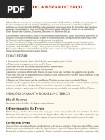 Graas e louvores se dem a todo momento ao Santssimo e Divinssimo Sacramento. Oferecimento do tero: Divino Jesus, eu Vos ofereo este tero, que vou rezar, contemplando os mistrios de nossa redeno. Concedei-me, pela intercesso de Maria, Vossa Me Santssima, a quem me dirijo, as virtudes que me so necessrias para bem rez-lo e a graa de ganhar as indulgncias anexas a esta santa devoo. Creio... Pai-Nosso... 3 Ave-Marias Primeiro quarto: Mistrios Gozosos