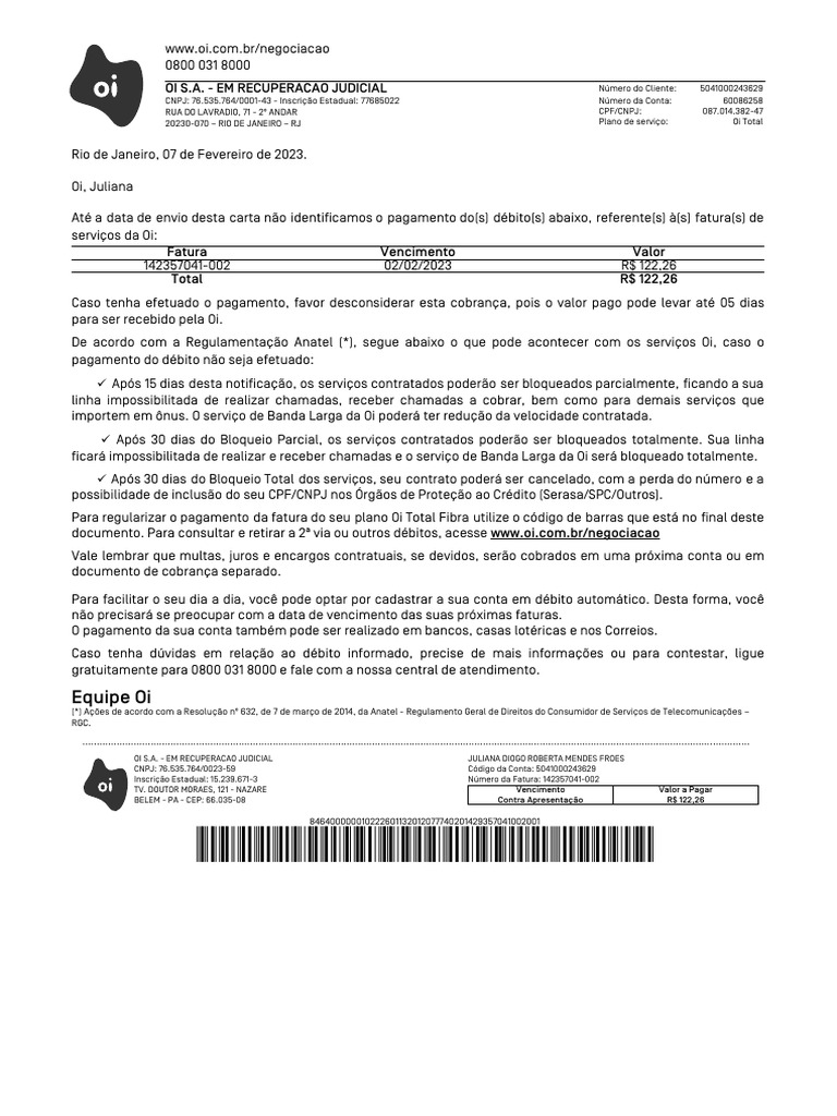 Para regularizar o pagamento da fatura do seu plano Oi Total Fibra utilize o código de barras que está no final deste