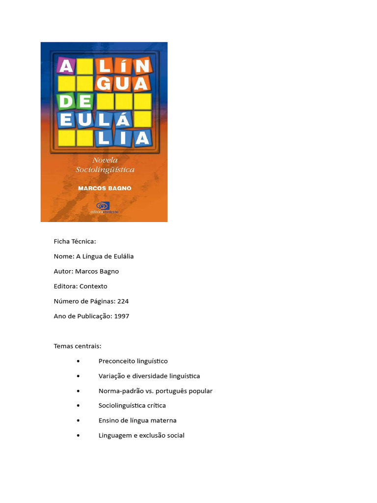 Marcos Bagno, em sua obra A Língua de Eulália: Novela Sociolinguística, constrói uma