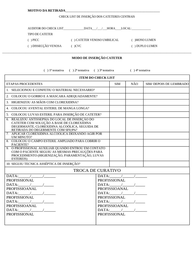 CHECK LIST DE INSERÇÃO E MANUTENÇÃO DE CATETERES CENTRAIS