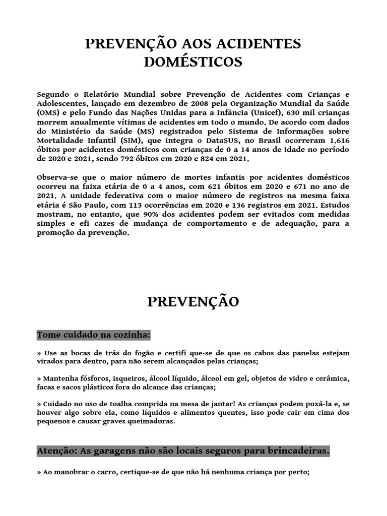 Segundo o Relatório Mundial sobre Prevenção de Acidentes com Crianças e