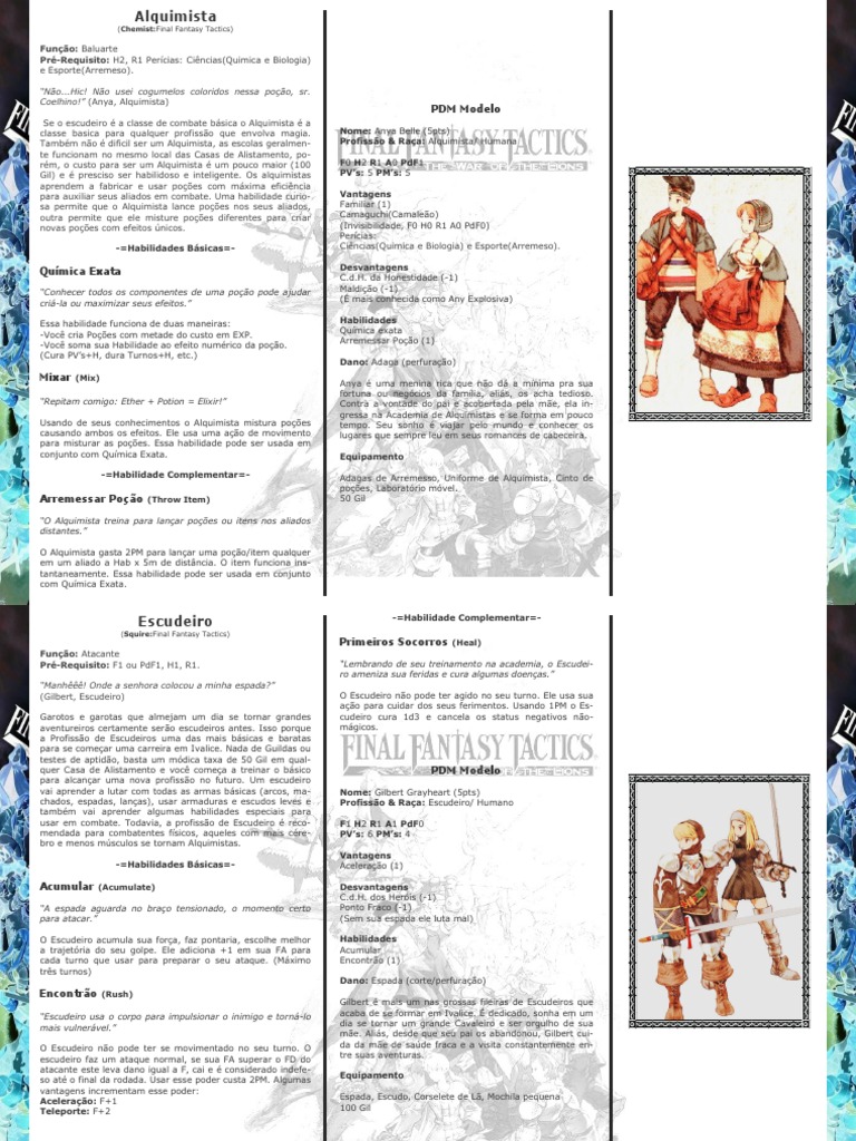 Funo: Atacante Pr-Requisito: F1 ou PdF1, H1, R1. Manh! Onde a senhora colocou a minha espada? (Gilbert, Escudeiro) Garotos e garotas que almejam um dia se tornar grandes aventureiros certamente sero escudeiros antes. Isso porque a Profisso de Escudeiros uma das mais bsicas e baratas para se comear uma carreira em Ivalice. Nada de Guildas ou testes de aptido, basta um mdica taxa de 50 Gil em qualquer Casa de Alistamento e voc comea a treinar o bsico para alcanar uma nova profisso no futuro. Um escudeiro vai aprender a lutar com todas as armas bsicas (arcos, machados, espadas, lanas), usar armaduras e escudos leves e tambm vai aprender algumas habilidades especiais para usar em combate. Todavia, a profisso de Escudeiro recomendada para combatentes fsicos, aqueles com mais crebro e menos msculos se tornam Alquimistas. -=Habilidades Bsicas=-