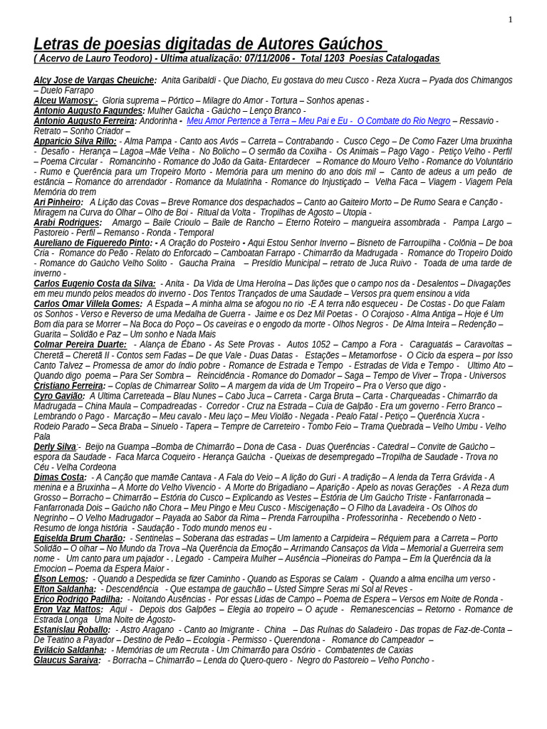 ( Acervo de Lauro Teodoro) - Ultima atualização: 07/11/2006 - Total 1203 Poesias Catalogadas