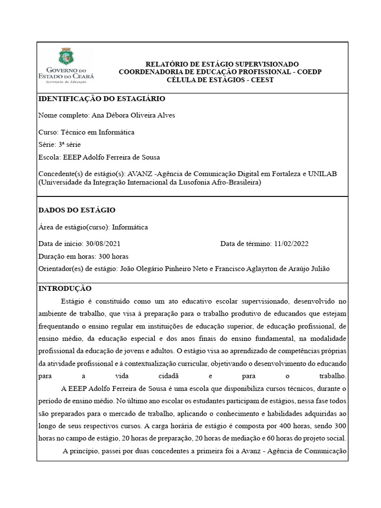 Concedente(s) de estágio(s): AVANZ -Agência de Comunicação Digital em Fortaleza e UNILAB