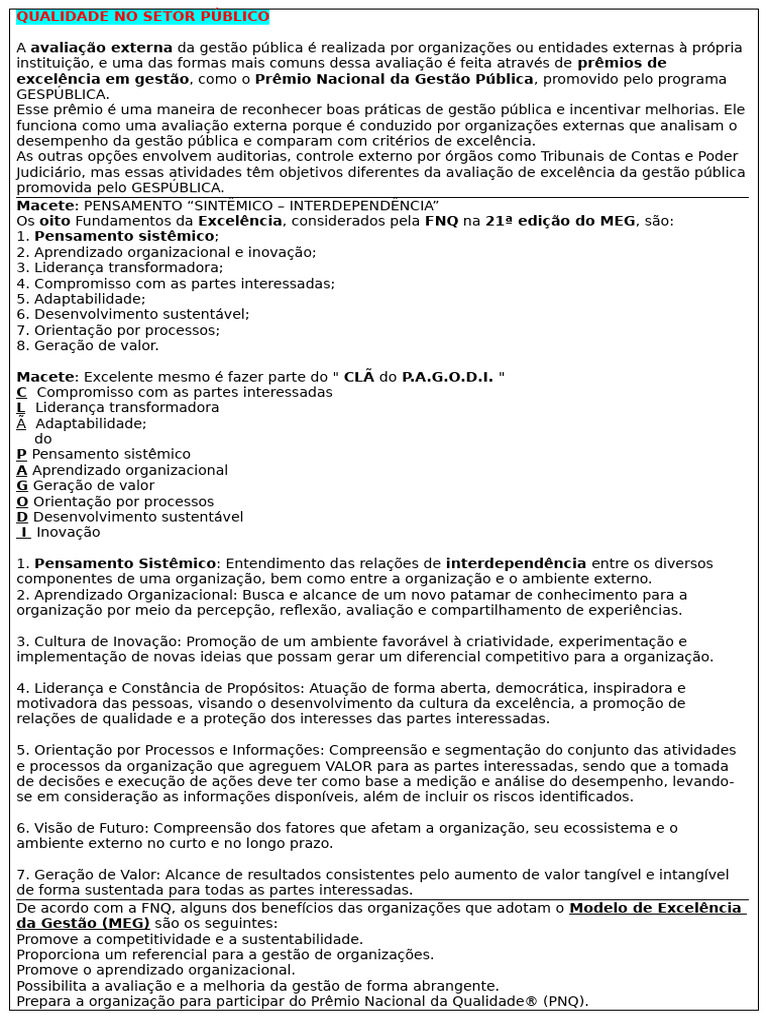 Os oito Fundamentos da Excelência, considerados pela FNQ na 21ª edição do MEG, são: