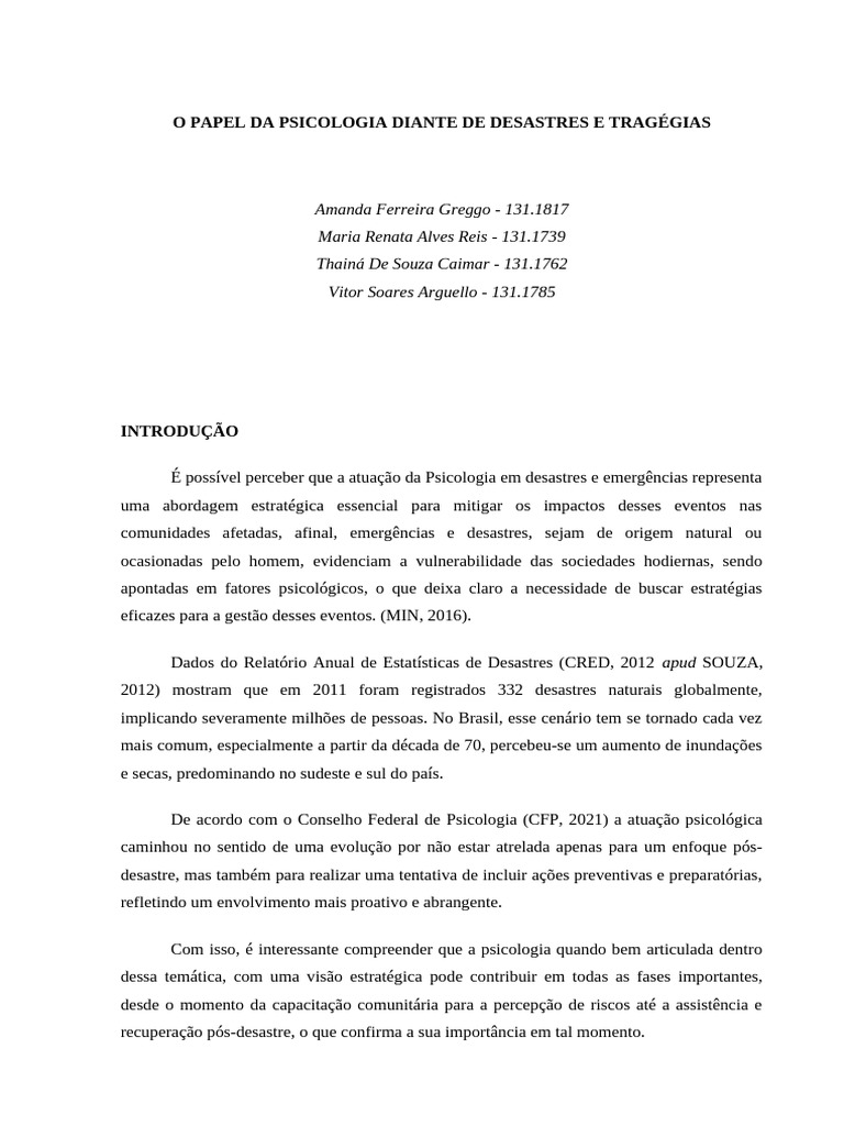 O PAPEL DA PSICOLOGIA DIANTE DE DESASTRES E TRAGÉGIAS