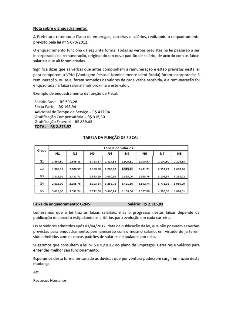 Sugerimos que consultem a lei nº 5.070/2012 do plano de Empregos, Carreiras e Salários para