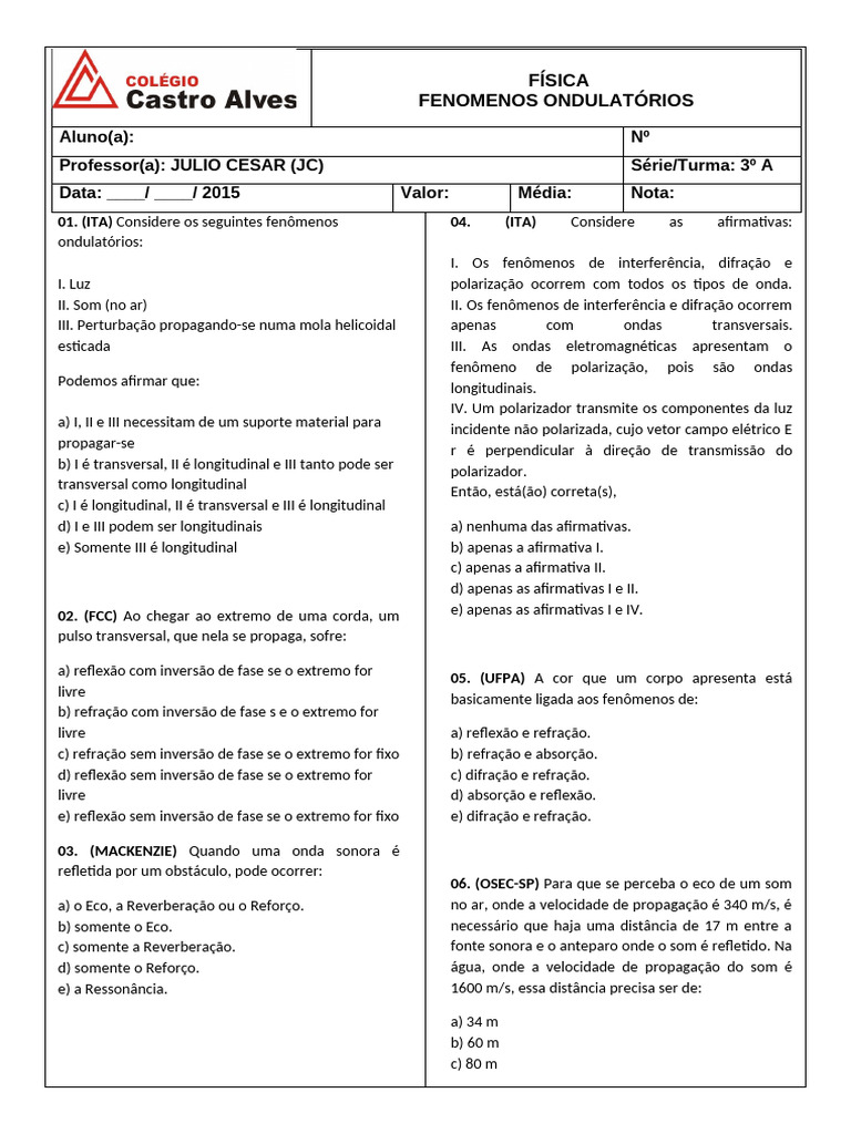 mantendo um único plano de oscilação. Outras 19. (UFRN) Rotineiramente, observa-se que a luz