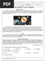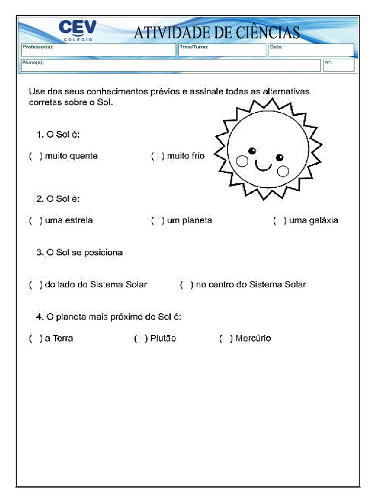 O documento apresenta uma atividade educacional sobre o Sol, onde os alunos devem assinalar as alternativas corretas sobre suas características. As questões abordam se o Sol é quente ou frio, sua classificação como estrela, planeta ou galáxia, sua posição no Sistema Solar e qual é o planeta mais próximo do Sol.