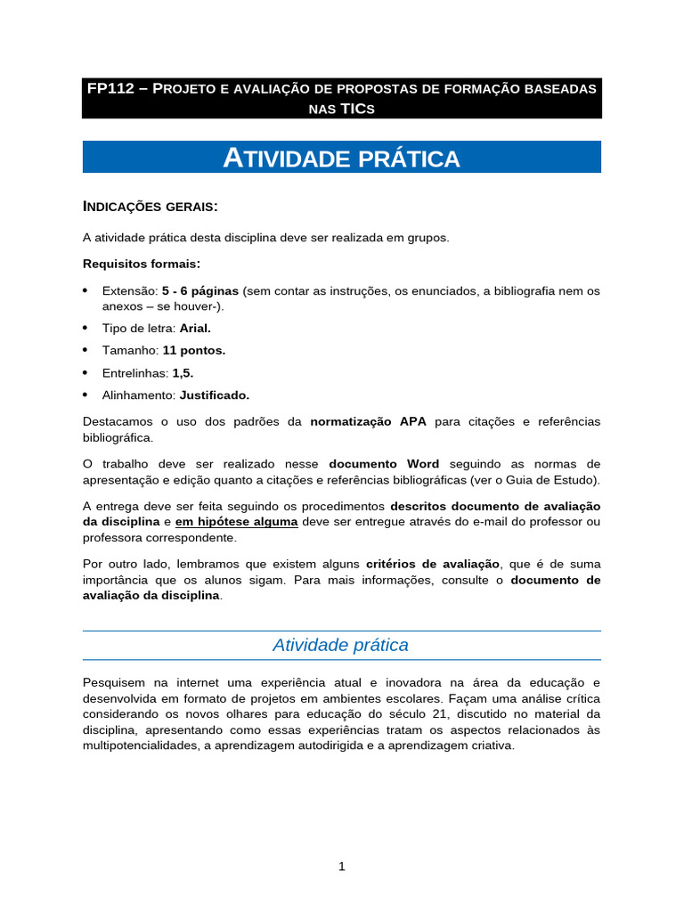 FP112 – PROJETO E AVALIAÇÃO DE PROPOSTAS DE FORMAÇÃO BASEADAS