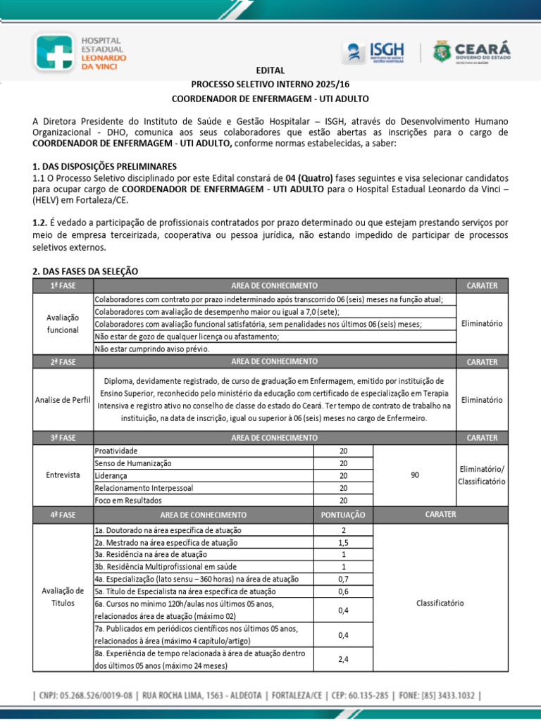 para ocupar cargo de COORDENADOR DE ENFERMAGEM - UTI ADULTO para o Hospital Estadual Leonardo da Vinci –