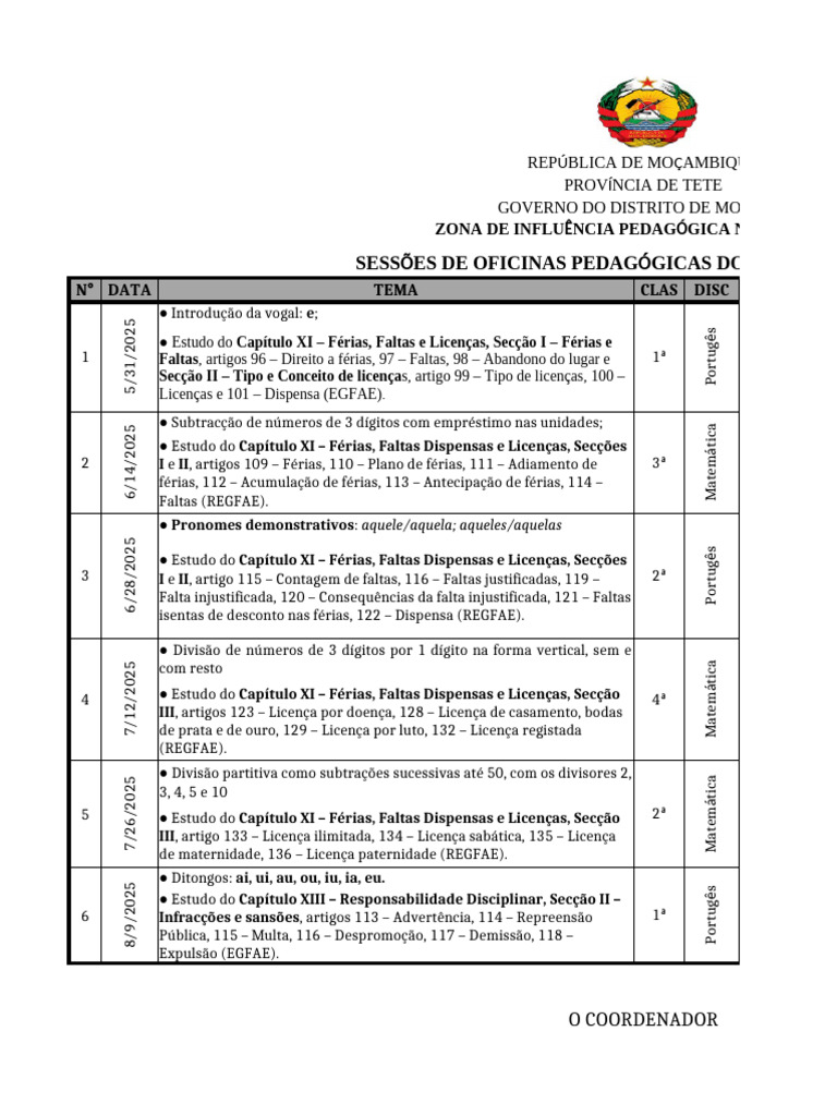 1 Faltas, artigos 96 – Direito a férias, 97 – Faltas, 98 – Abandono do lugar e 1ª