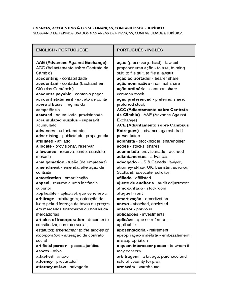 GLOSSÁRIO DE TERMOS USADOS NAS ÁREAS DE FINANÇAS, CONTABILIDADE E JURÍDICA