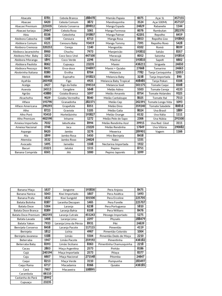 Abacate 8781 Cebola Branca 288478 Mamão Papaia 6075 Açai 1L 457155