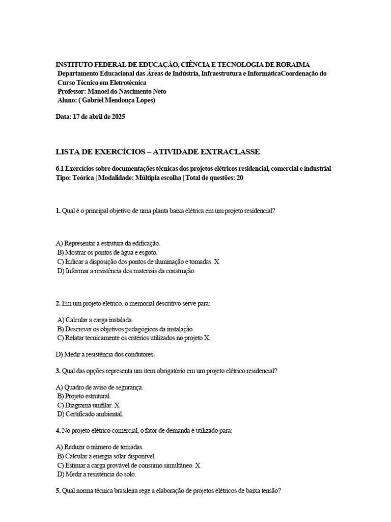 6.1 Exercícios sobre documentações técnicas dos projetos elétricos residencial, comercial e industrial