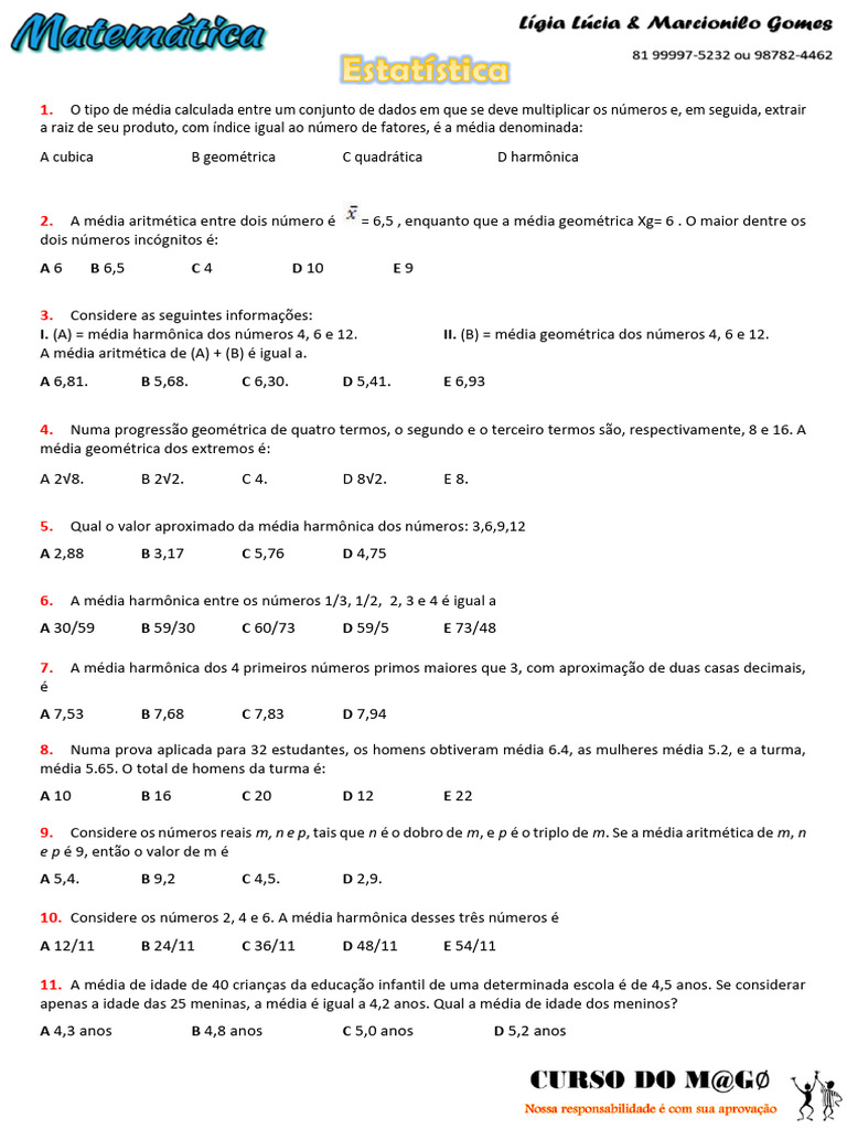 11. A média de idade de 40 crianças da educação infantil de uma determinada escola é de 4,5 anos. Se considerar