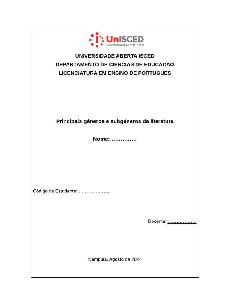 o Analisar os principais géneros e subgéneros da literatura, discutindo seus
