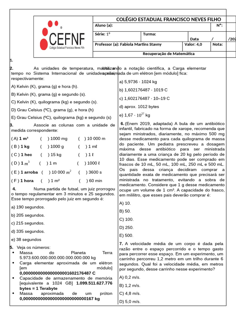 3. Associe as colunas com a unidade de 6. (Enem 2019, adaptada) A bula de um antibiótico